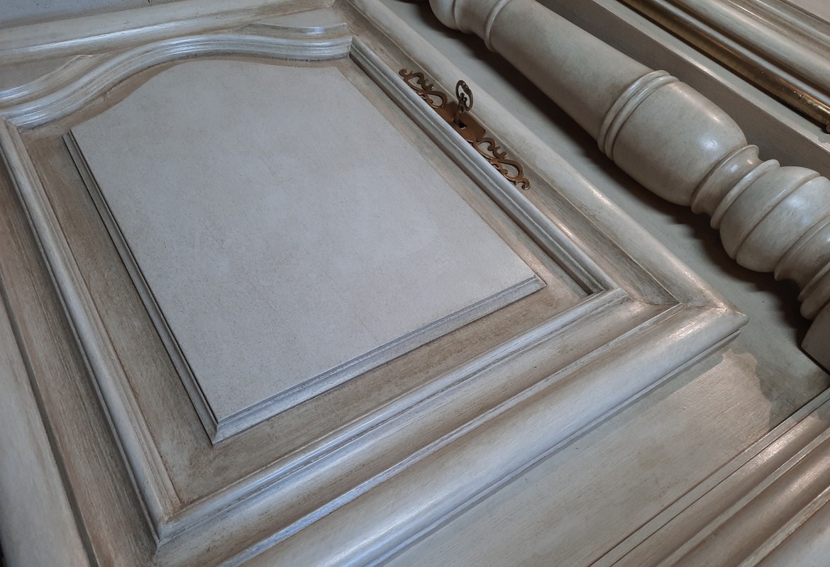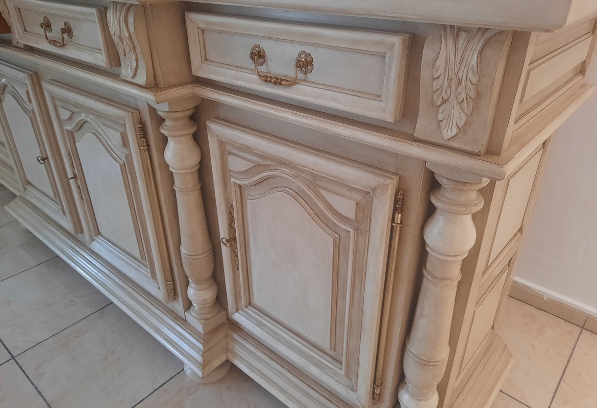 Le projet décoratif choisi par mon client consiste à peindre le meuble dans une teinte claire, mettre en valeur les moulures par des réchampis blancs et créer des ombrages dans les plates bandes des portes et des côtes du meuble. Des glacis de salissure donneront du relief, de la profondeur et le "vécu" qui fait toute la différence en décor.