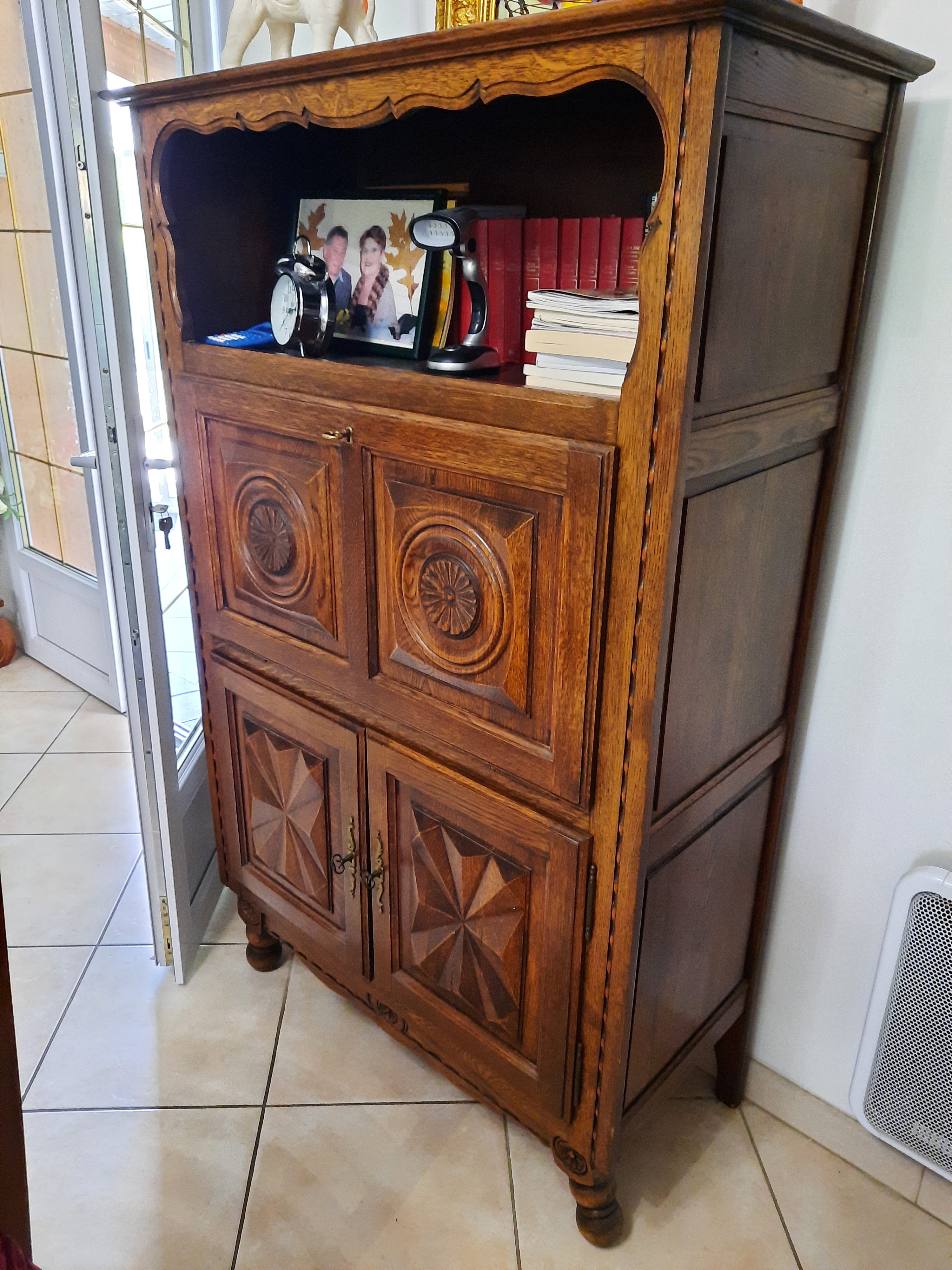 Secrétaire à abattant en chêne massif avec portes sculptées.