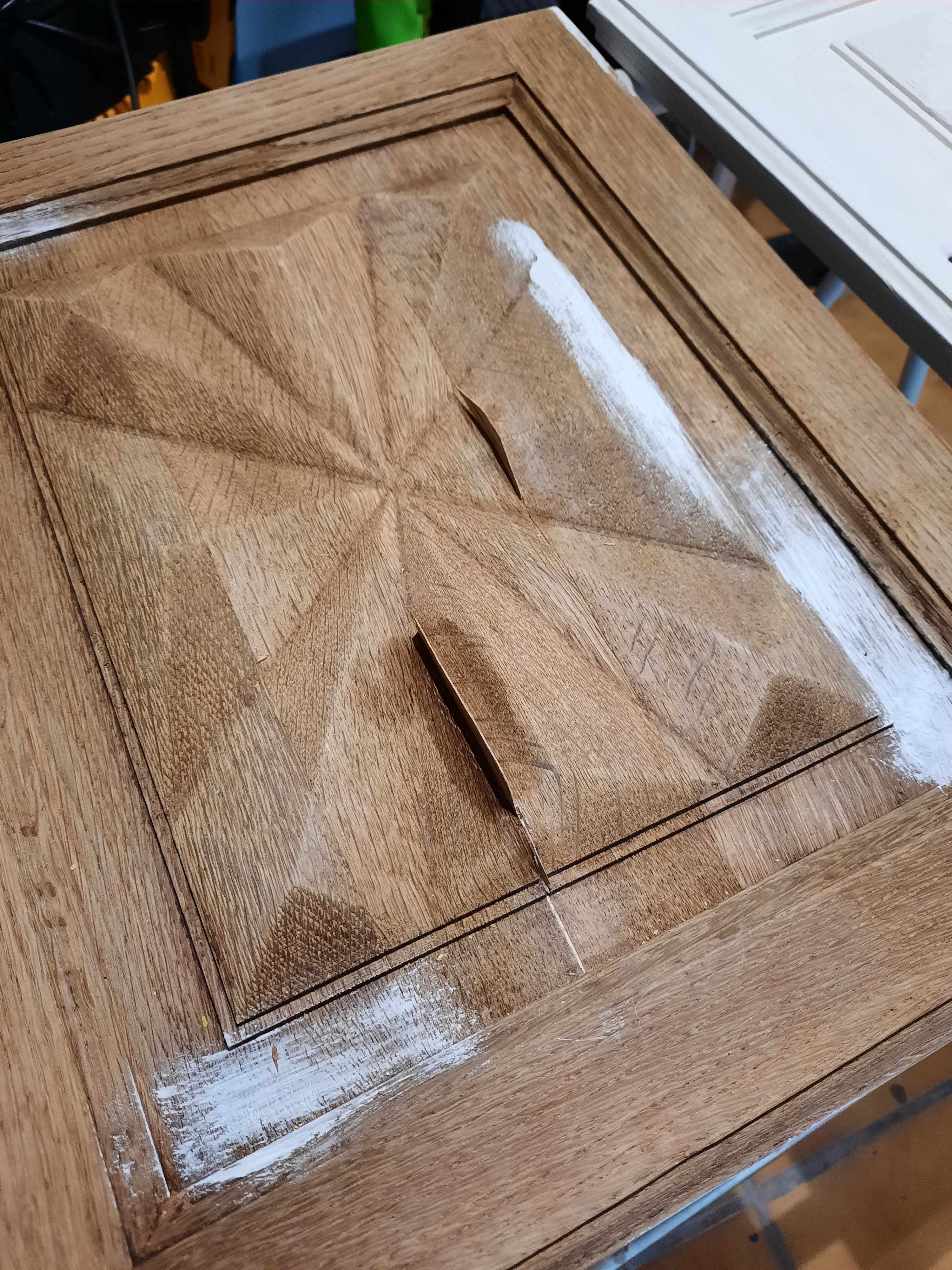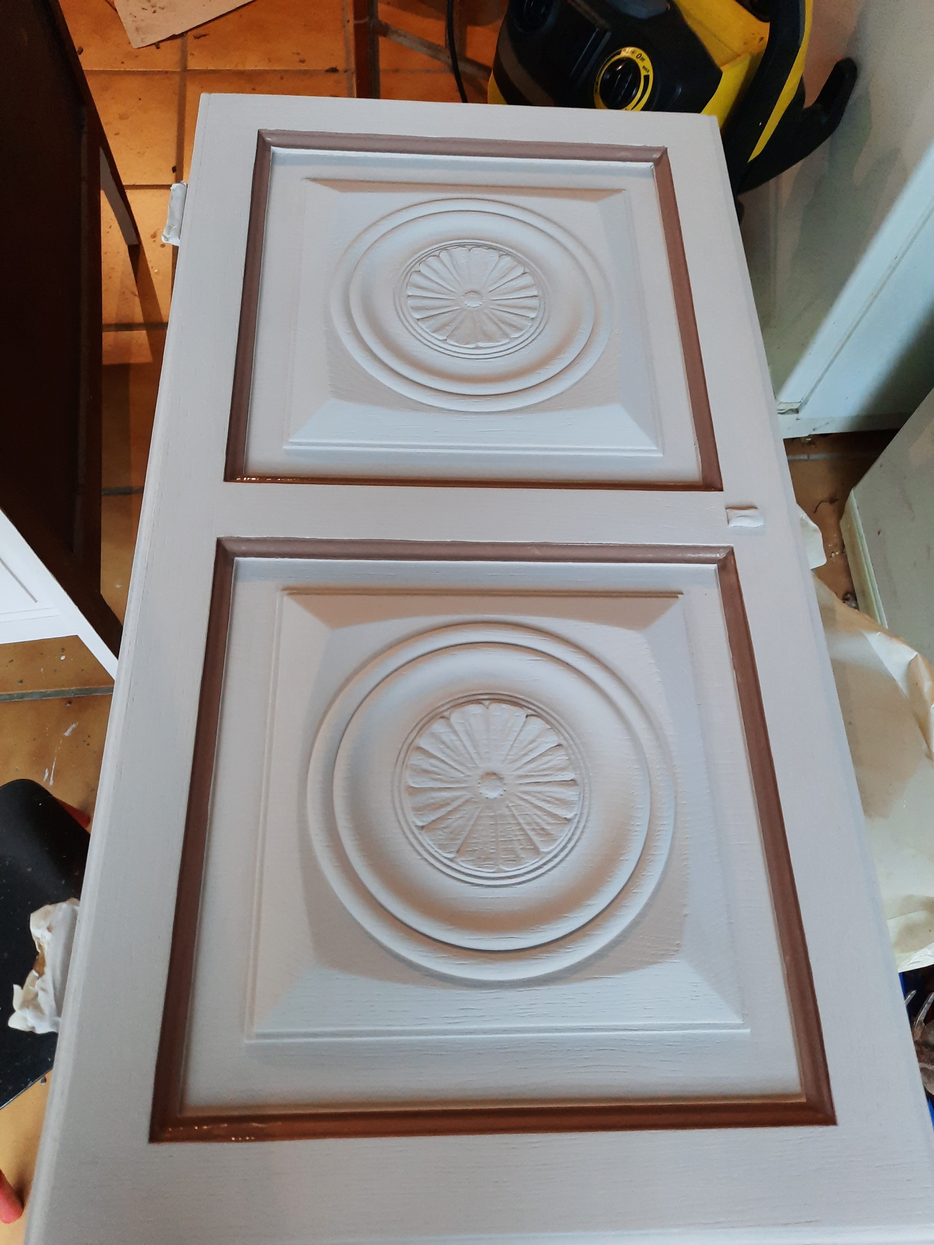 Je nettoie et patine les quincailleries (charnières, entrées, clés) et protège l'ensemble du meuble avec deux couches de vitrificateur mat.