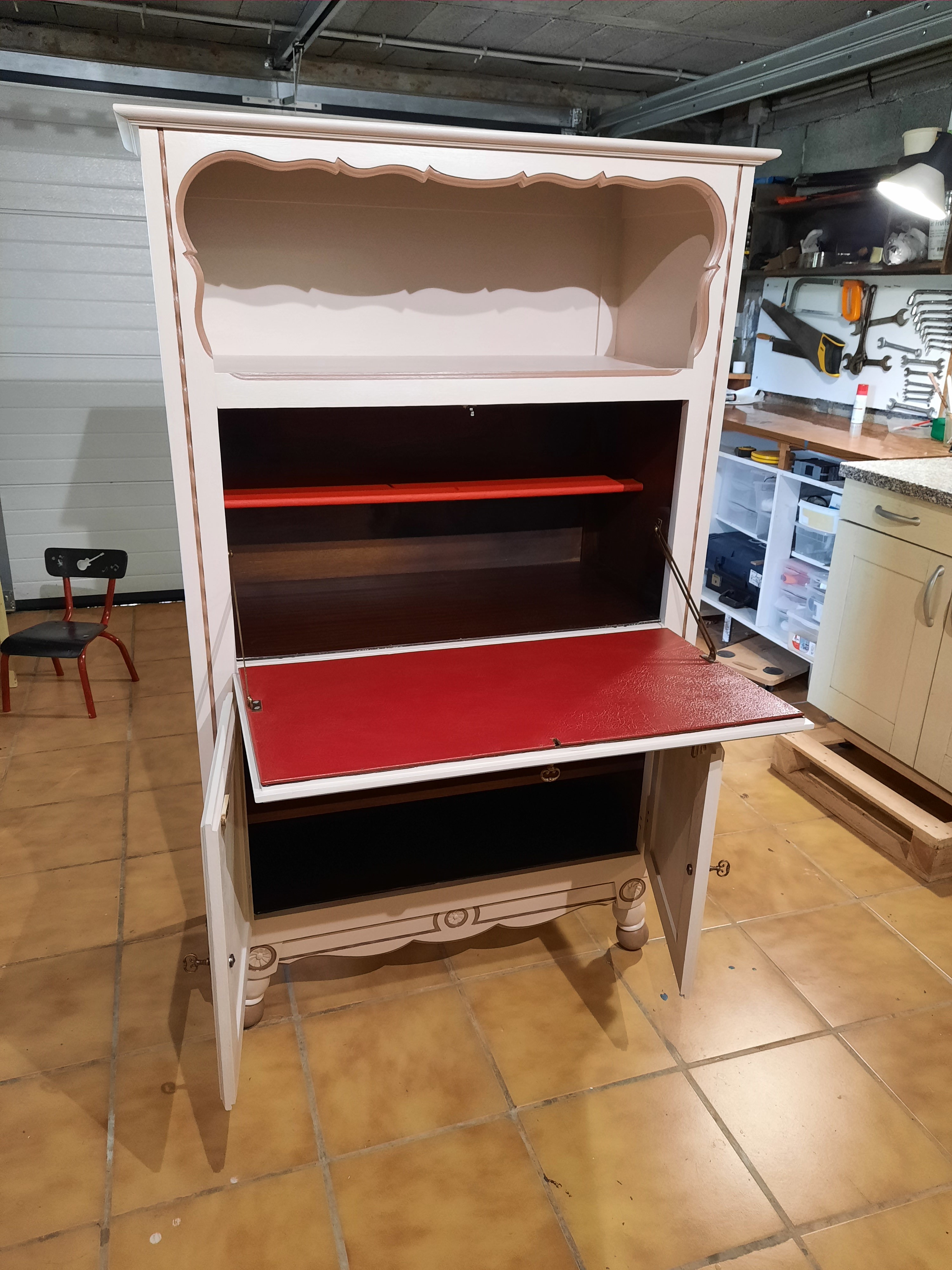 Deuxième meuble de la série, ce secrétaire fait office de bar dans le salon de mes clients. Il est un peu austère dans son vernis marron.