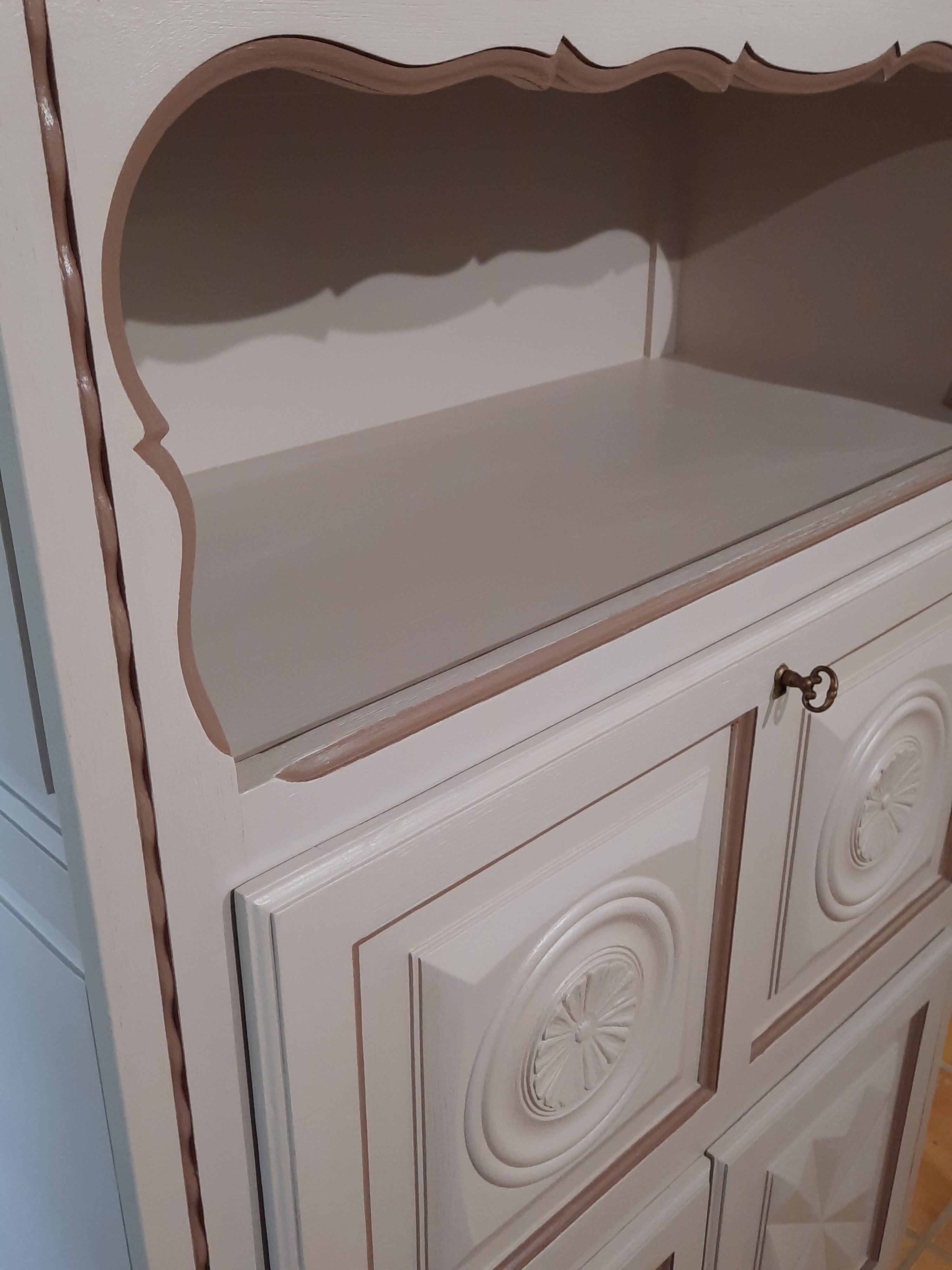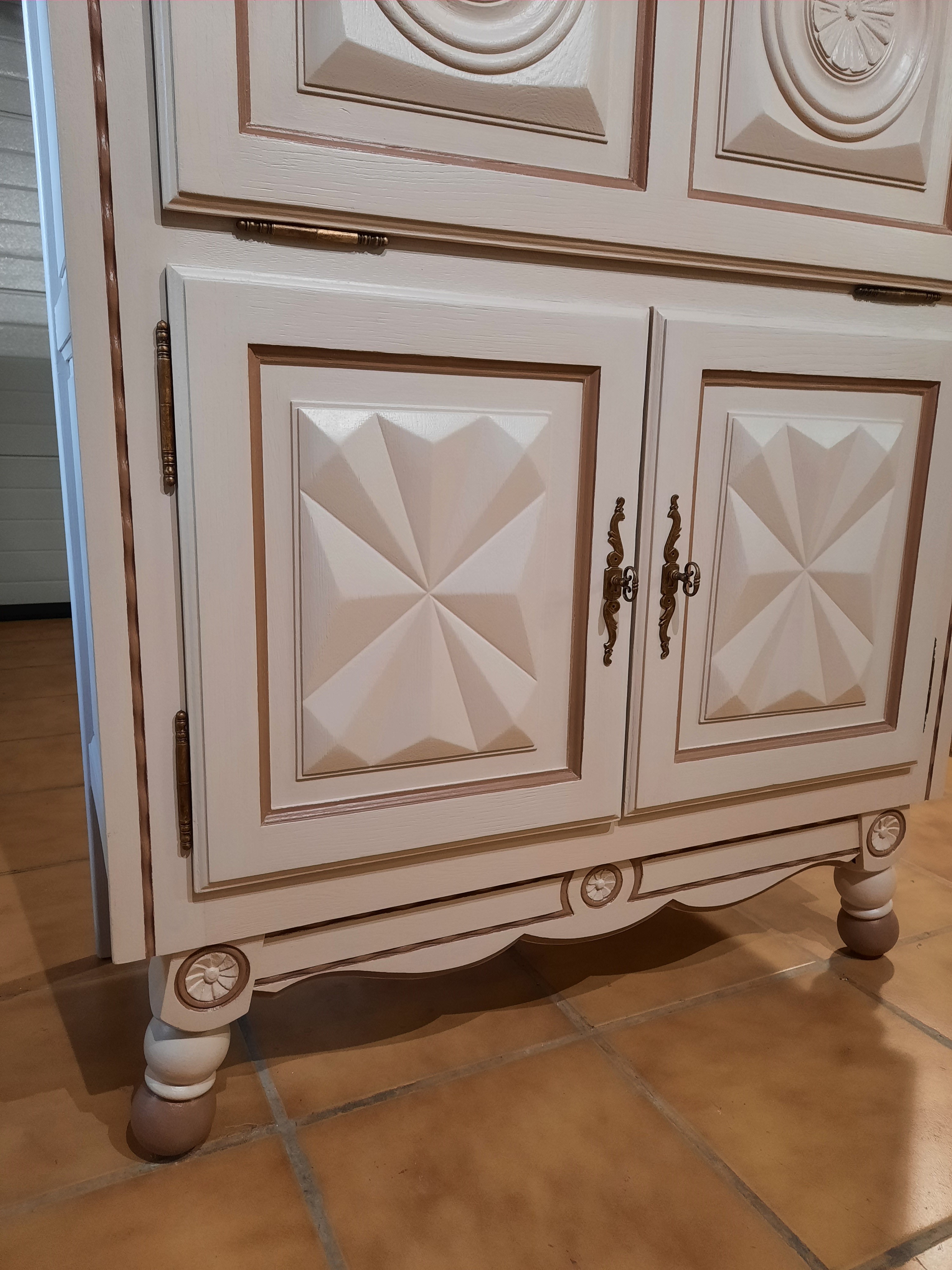 Pour harmoniser la décoration du salon, ce meuble adopte les ton chamois et chocolat de l'enfilade. les sculptures en rosaces, en cercles concentriques et en pointes de diamant restent de couleurs claire pour ne pas alourdir la silhouette du meuble.