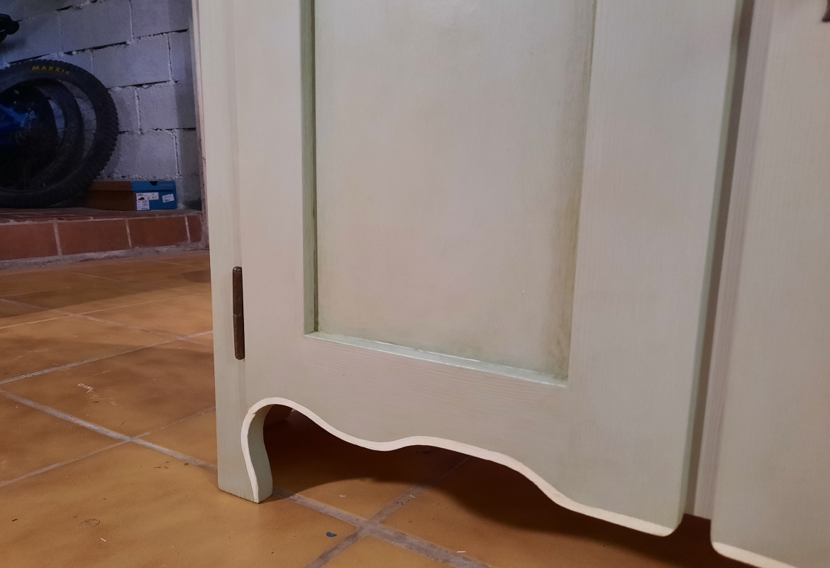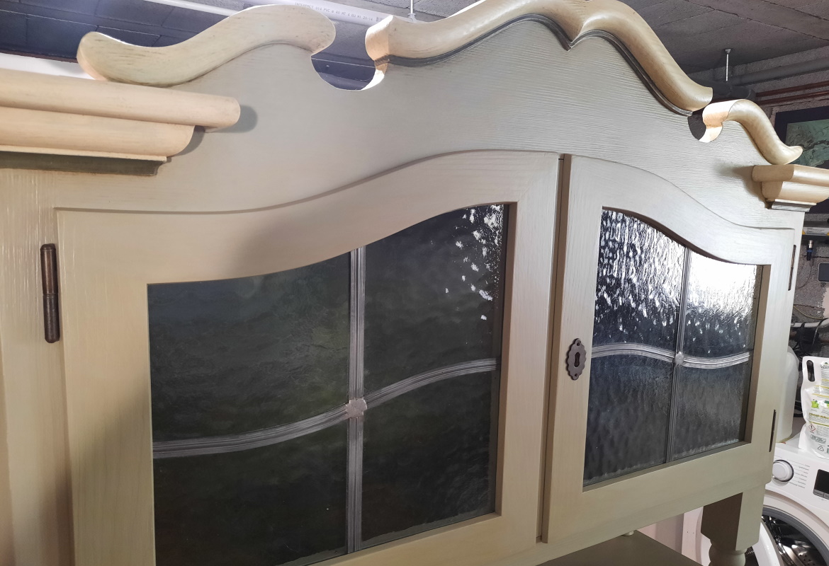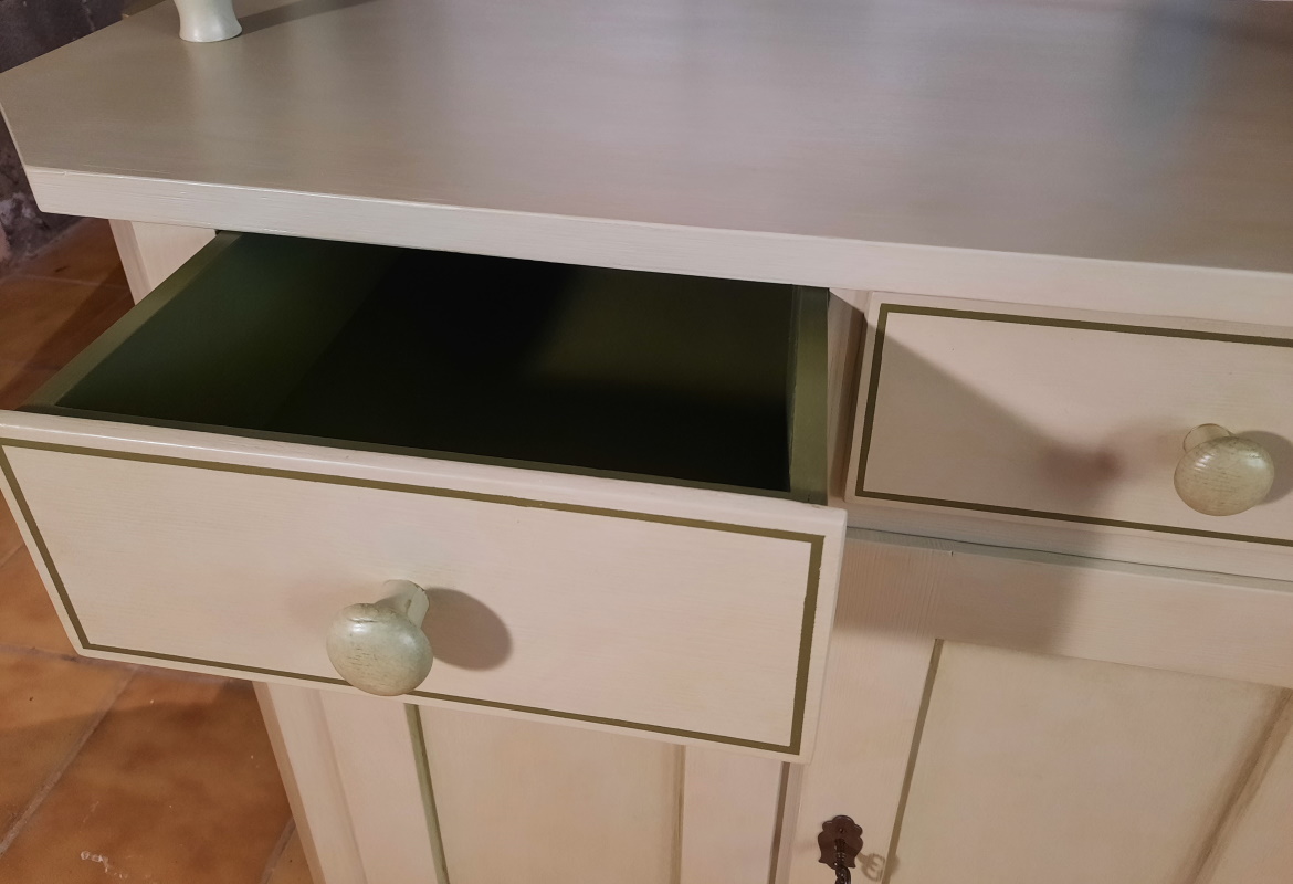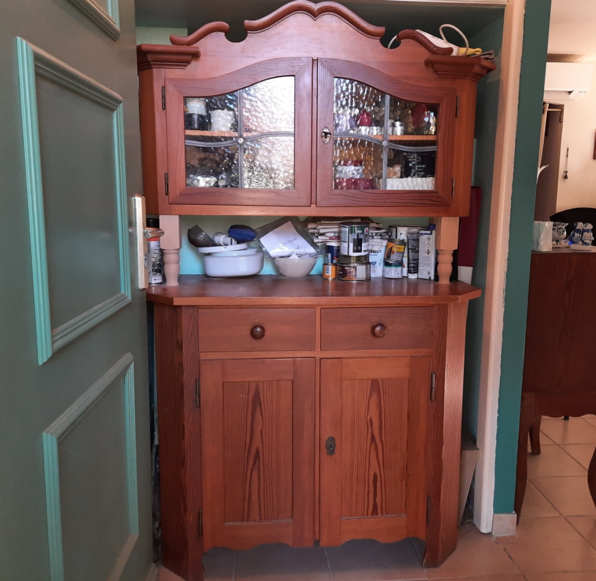 Référence à la nature pour ce vaisselier en pitchpin transformé en deux tons de vert. Ma cliente souhaitait retrouver la couleur des feuilles d'olivier, je mes suis donc inspirée des oliviers de mon jardin pour créer la teinte.