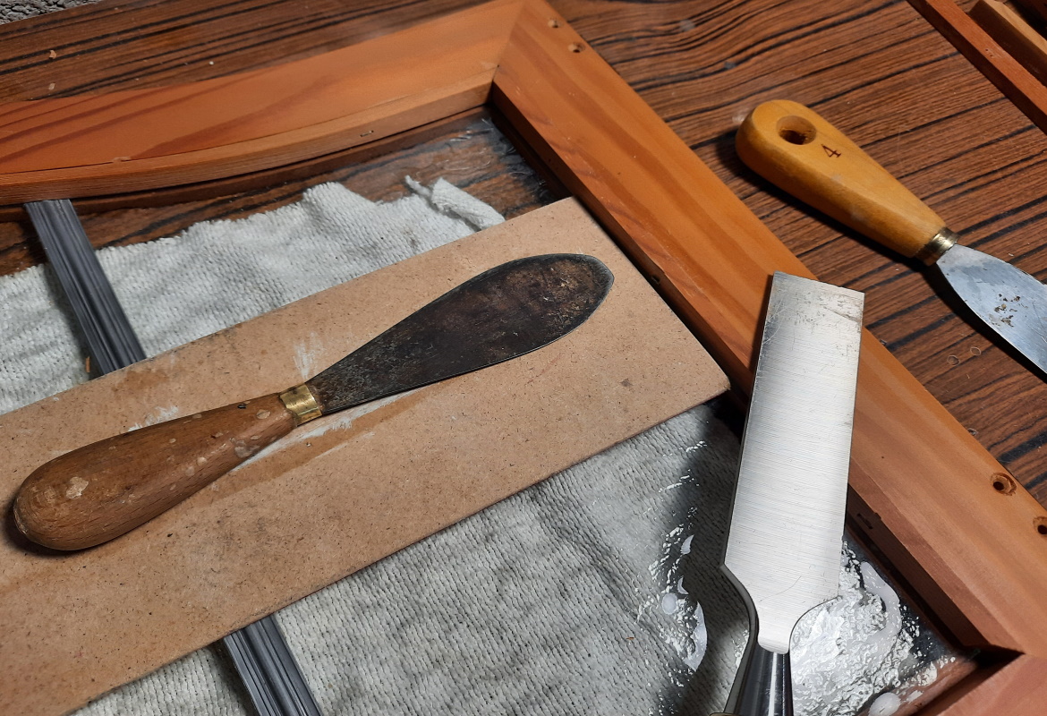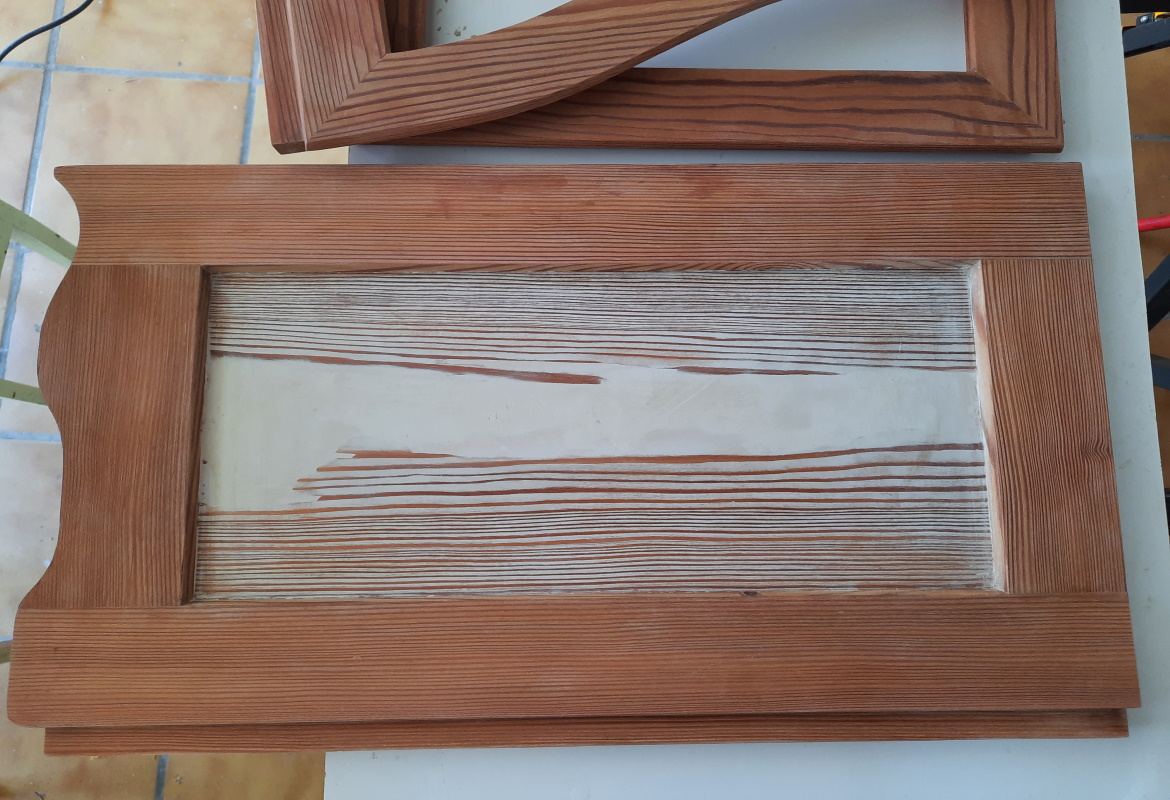 Après le démontage des vitres et des quincailleries, le bois a été mis à nu. Le placage fendu des portes du bas a nécessité des restaurations avant la pose de la couche d'impression.