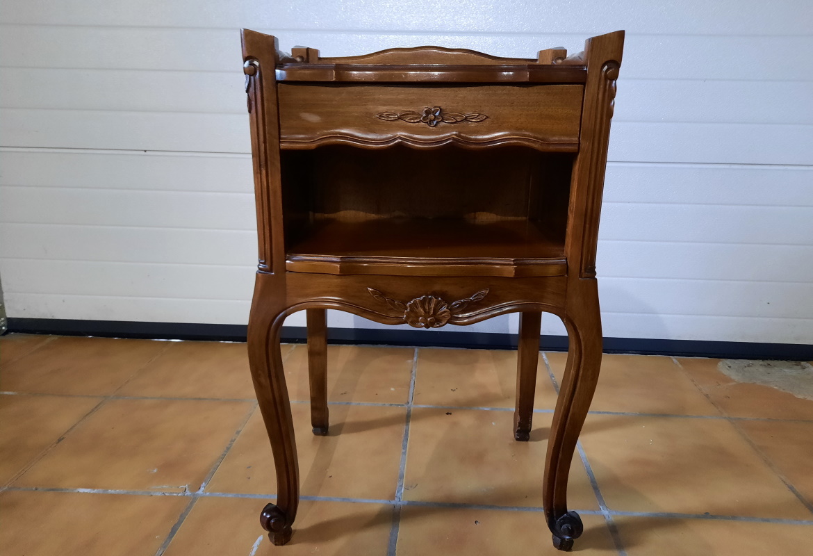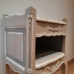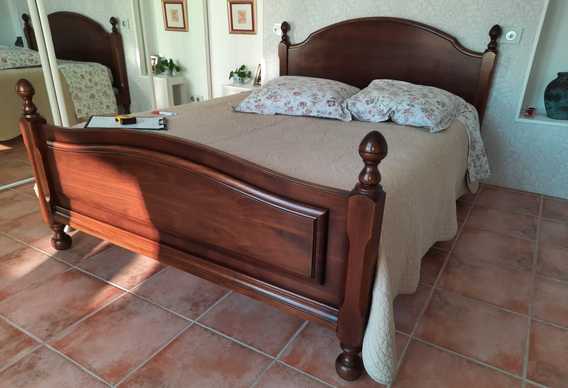 Ce lit et ce chevet en merisier de bonne facture n'étaient plus au goût de ma cliente qui souhaitait les transmettre à son fils. Elle a donc fait appel à l'atelier pour donner un coup de jeune à cette chambre.