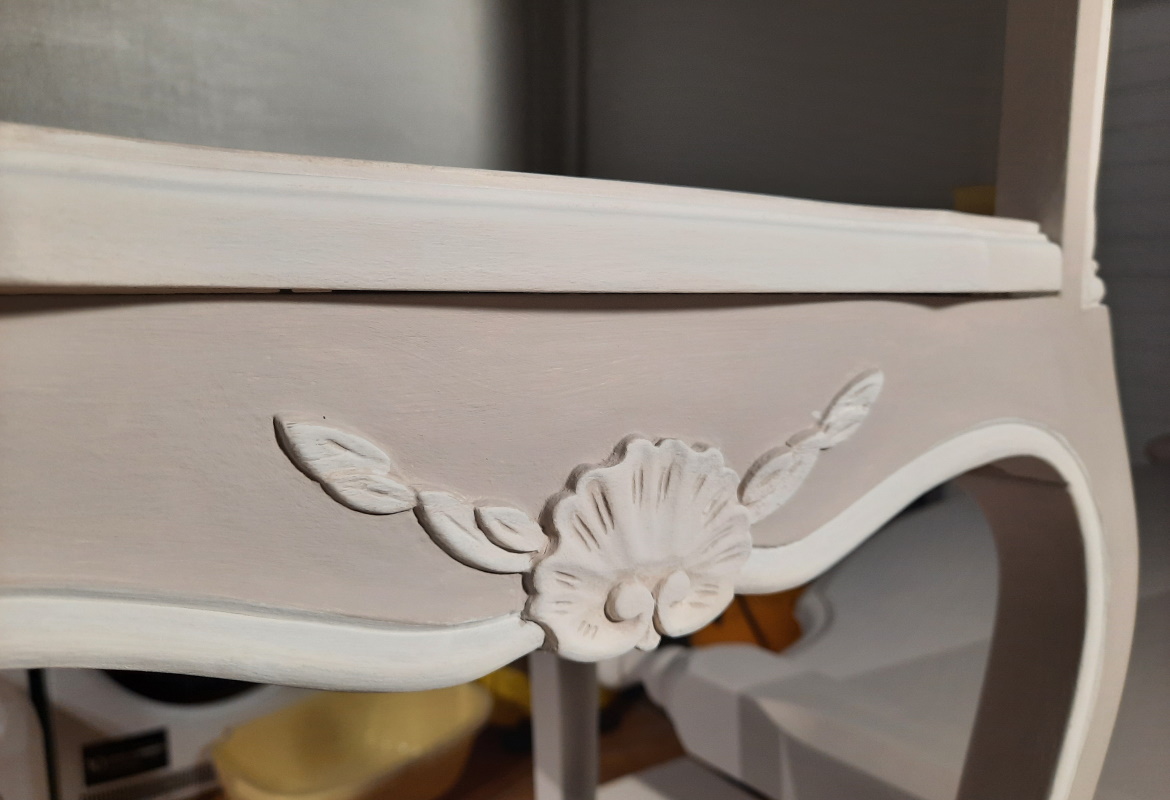 Une peinture à l'essuyé couleur lin a été choisie pour son côté lumineux et intemporel. Les sculptures et moulures sont ainsi mises en valeur en blanc. L'ombrage des plates-bandes et la teinte gris taupe de la niche et de l'intérieur du tiroir du chevet modernisent cet ensemble de meubles.