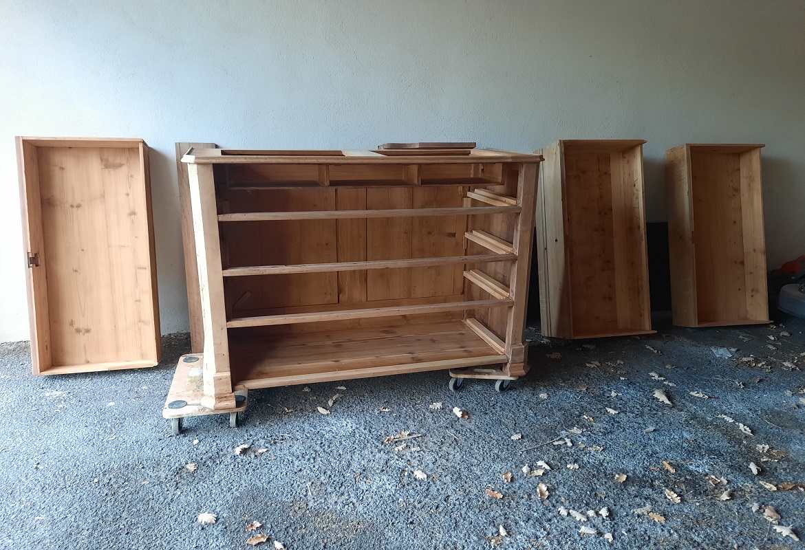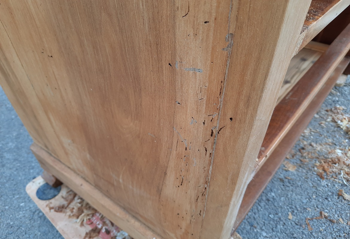 Le bois a subi les attaques d'insectes xylophages et le vernis s'est décoloré avec les années nécessitant une mise à nu complète du bois et un traitement préventif et curatif.