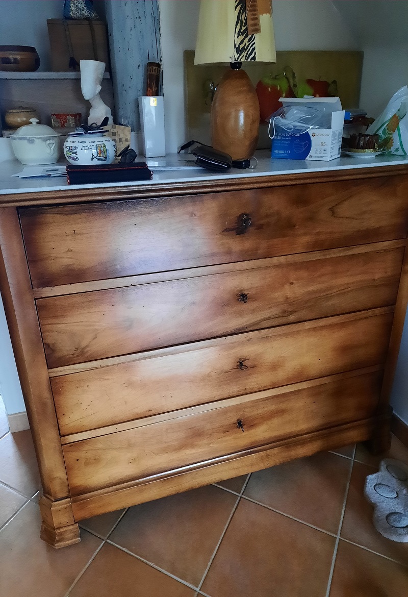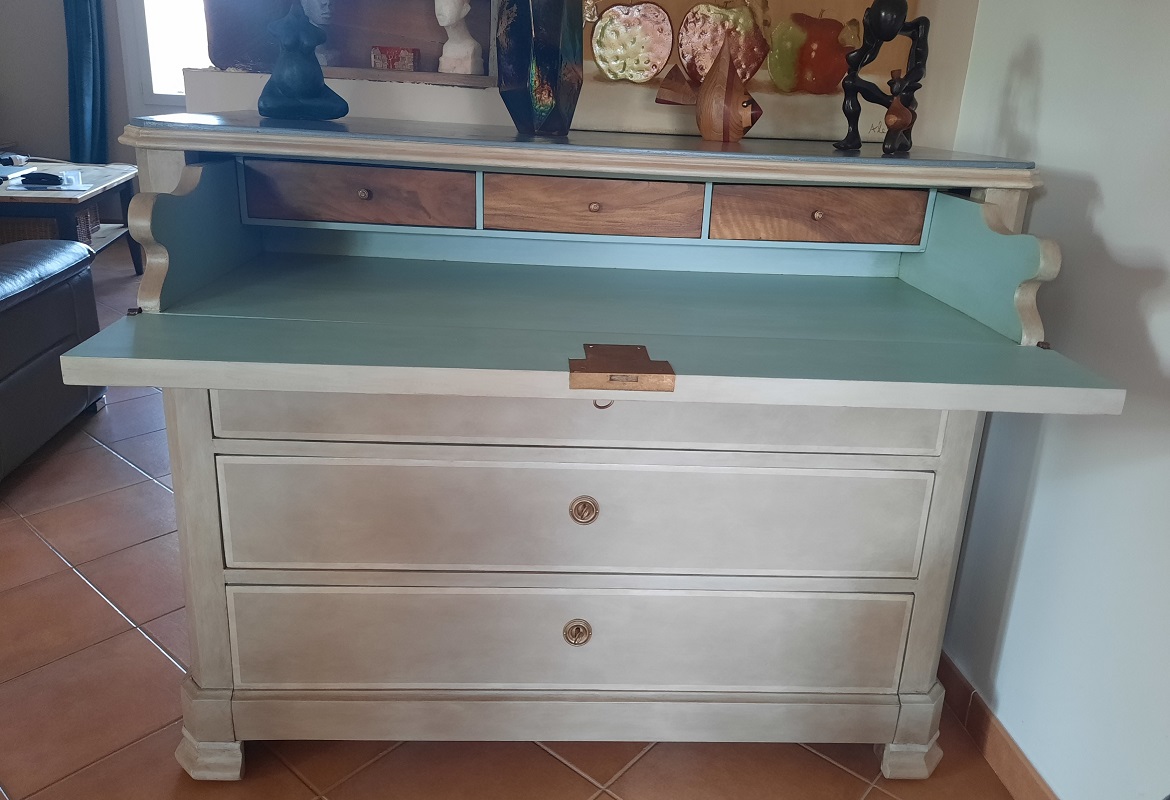 Relooking et restauration complète de cette commode-bureau en noyer d'inspiration Louis Philippe.