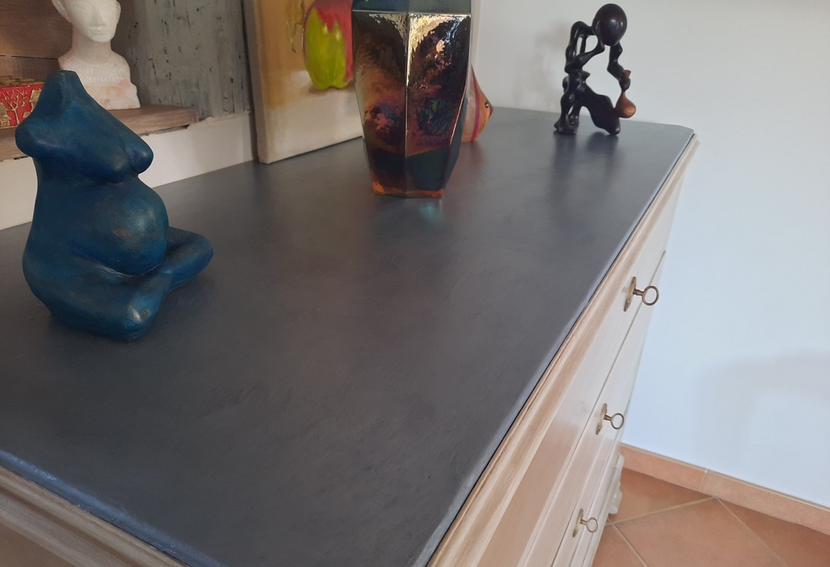Après masticage et lissage des trous de vers et application d'une couche d'impression adaptée, le choix décoratif s'est porté sur une teinte grège douce et neutre pour s'intégrer dans n'importe quelle décoration.