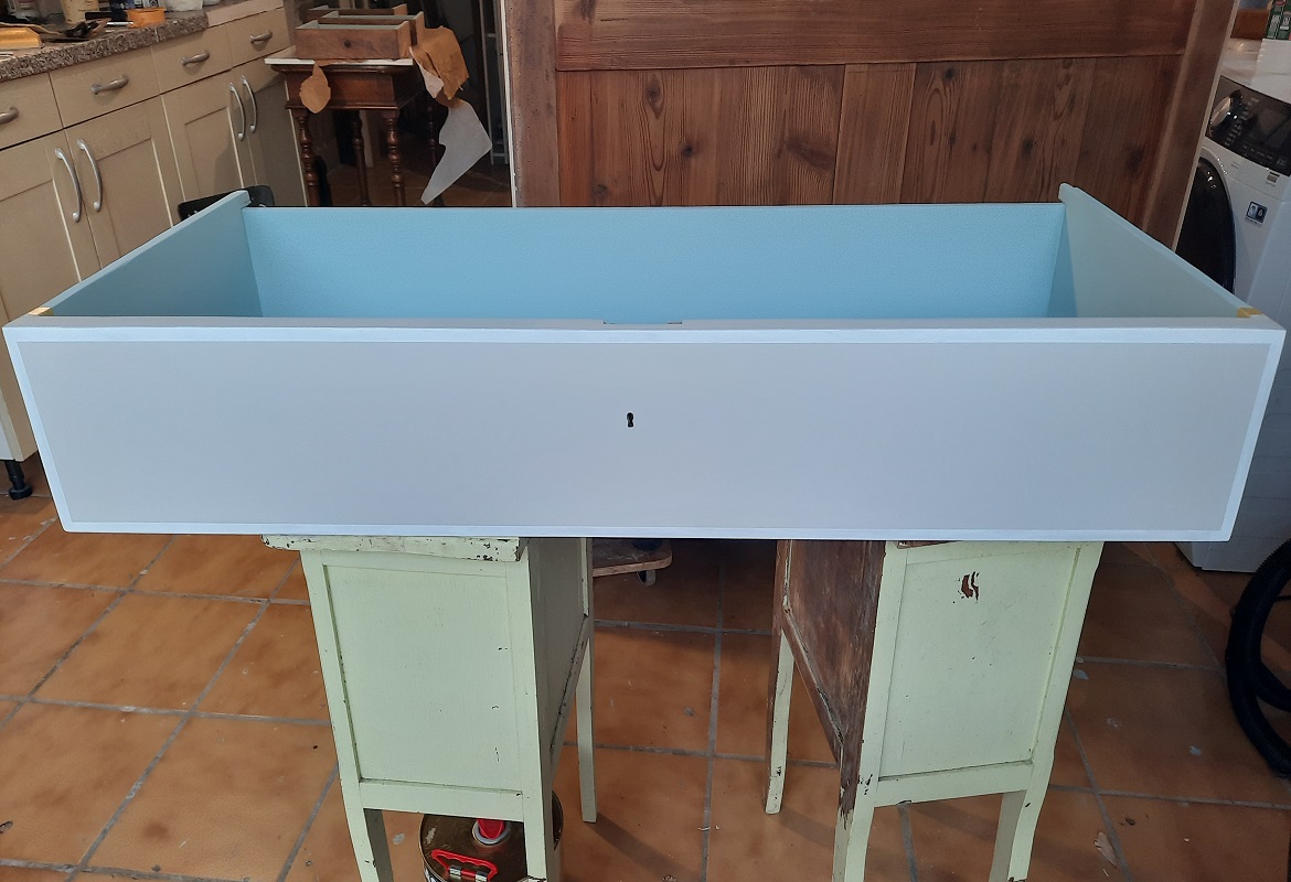L'intérieur des tiroirs et le plateau coulissant sont peints en bleu céladon et patinés. J'ai conservé le veinage du bois sur les façades des trois petits tiroirs internes de la partie bureau.