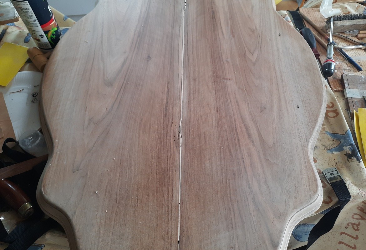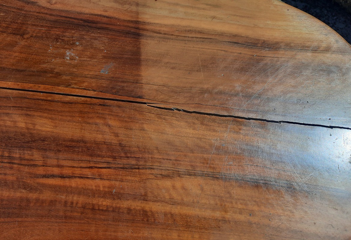 Gros travail de restauration sur le plateau de la table fendu dans la longueur avec pose d'un flipot et masticage.