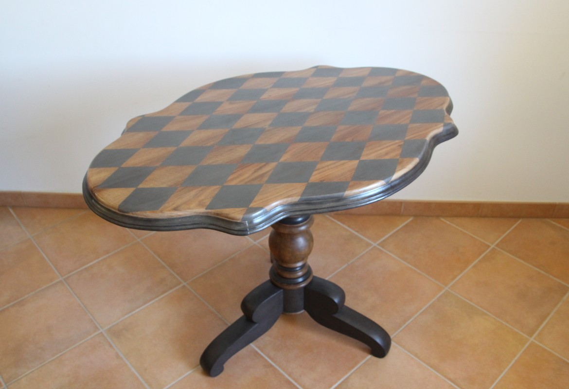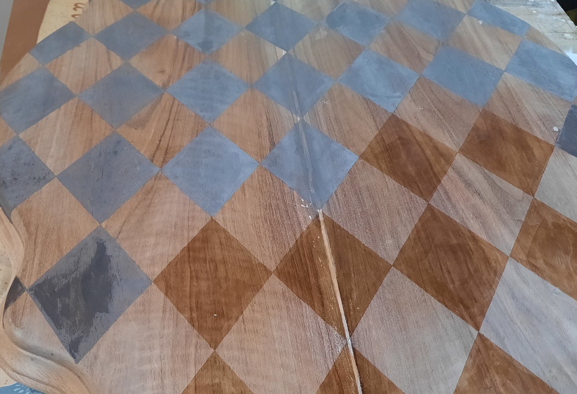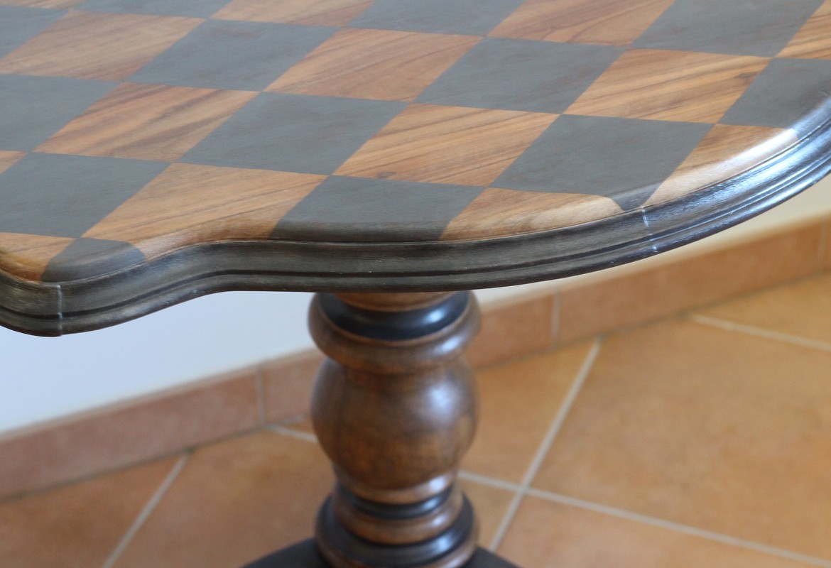 Création de motifs de losanges à mains levées sur le plateau, réchampi de la moulure du plateau et mise en couleur du pied.